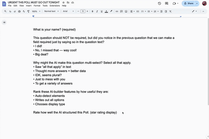 Skip the blank page. With AI Quickstart, just paste or type your questions, and watch them instantly transform into a ready-to-send poll.